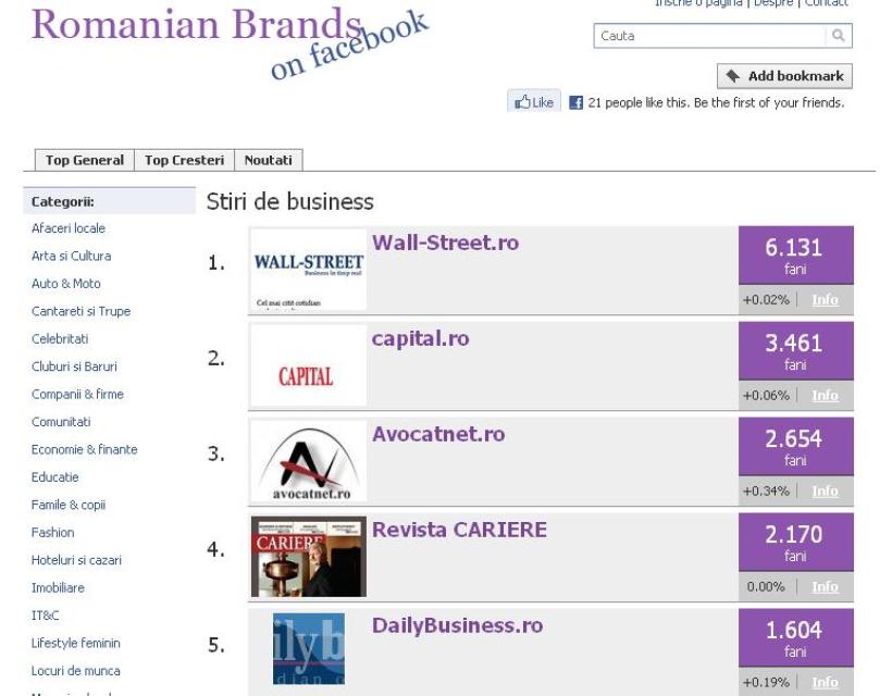 Aplicatia Romanian Brands on Facebook ordoneaza paginile romanesti in functie de numarul de fani, le imparte pe categorii, oferind de asemenea si posibilitatea de cautare. Conform Refresh.ro, unealta este dezvoltata de Andrei Stefan, webdeveloper freelancer, proprietarul lumeaemica.ro.