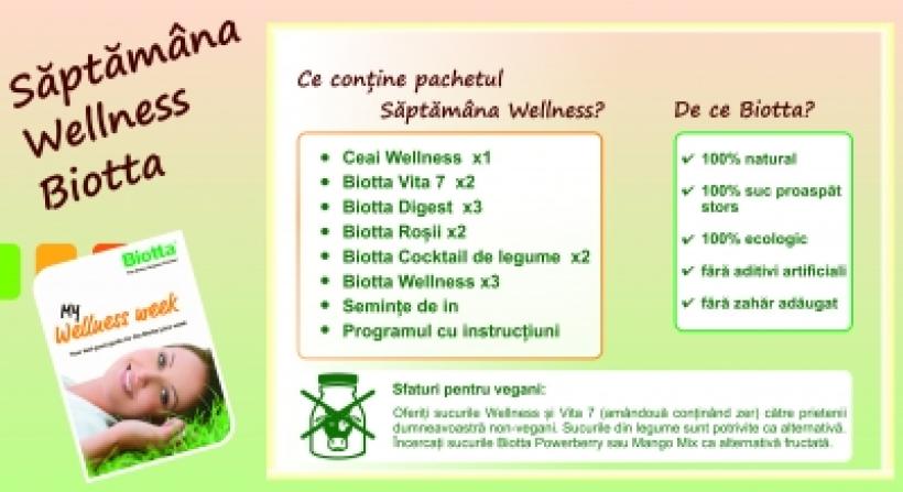 Săptămâna Wellness Biotta este un pachet compact şi natural de purificare, dezvoltat în colaborare cu dieteticieni calificaţi. Combinaţia optimă dintre sucurile de fructe şi legume ecologice asigură alimentarea oraganismului cu vitamine, minerale şi nutrienţi esenţiali de-a lungul întregii săptămâni de refacere.