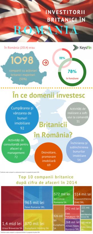 Printre investitorii britanici importanţi din România mai întâlnim nume precum British American Tabacco, Paypoint Service SRL, Glaxosmithkline Consumer Healthcare SRL, Xerox Romania şi Eurest Rom SRL, fiecare cu afaceri în 2014 între 78 şi 180 milioane de lei. Producţia de software, comerţul şi producţia de îmbrăcăminte adună împreună 1,8 miliarde lei, iar industria tutunului şi cea a jocurilor de noroc plusează cu peste jumătate de miliarde de lei.