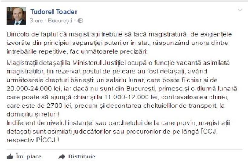 Pe 25 mai, Ministrul Justiţiei, Tudorel Toader, a declarat la Parlament că a solicitat CSM să înceteze detaşările tuturor magistraţilor, deoarece ministerul trebuie să-şi angajeze personal propriu, pe care să îl formeze, „să îl fidelizeze” în spiritul Ministerului Justiţiei şi pe care să conteze mulţi ani de acum înainte.