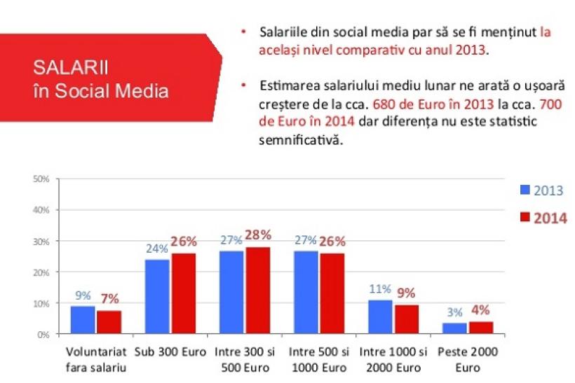 Salariul mediu nu a crescut semnificativ fata de 2013, de la 680 Euro net la 700 Euro net in 2014. Datele provenite de la companii confirma marjele de 350 Euro – 600 Euro net pentru un nivel de experienta de maxim 1.5 ani, respectiv 500 Euro – 850 Euro net pentru un nivel de experienta intre 1.5 si 3 ani, ajungand pina la marje intre 800 Euro net si maxim 1300 Euro net pentru putinii specialisti care au experienta de peste 3 ani in Social Media.
