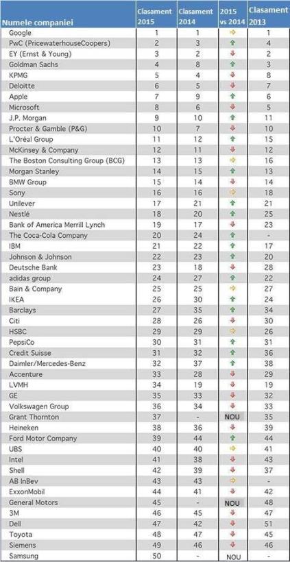 Acestea sunt rezultatele la nivel mondial. Dacă ne uităm doar la Europa, cele mai atractie companii pentru studenţii la management sunt : Google, LOreal, Microsoft, EY, pwc, McKinsey&Company, Unilever, KPMG, Nestle si BCG.