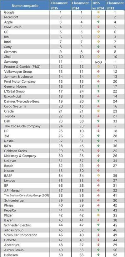 Tinerii ingineri rămân atraşi de către companii inovatoare. Deşi Google e pe primul loc, nici Microsoft nu se lasă şi staţionează pe a doua poziţie. Nu se ştie până când, pentru că Apple este în ascensiune în preferinţele absolvenţilor, până pe al treilea loc în acest an. Concurentul său direct, Samsung a intrat pentru prima oară în clasament, direct pe poziţia 11. Primele cinci poziţii din clasament celor mai atractive companii pentru studenţii la inginerie sunt completate de BMW şi GM. Devin din ce în ce mai interesante companiile care produc produse de larg consum, cum ar fi Nestle, Unilever sau Heineken şi îşi pierd din atractivitate comapniile din sectorul energetic: Schlumberger, BP sau Exxon Mobil pierd locuri.