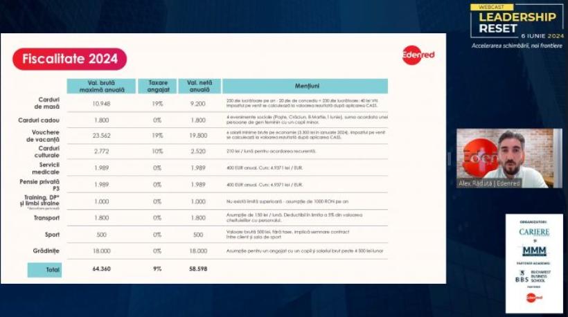 În ciuda contextului fiscal nefavorabil, bugetele de beneficii continuă să crească. Valoarea tichetelor de masă a crescut de la 30 la 40 RON în 2024, iar bugetul lunar de beneficii a crescut semnificativ în ultimii ani, ajungând la 884 RON în 2024. În funcție de industrie, bugetele de beneficii variază, cu valori mai mari în IT și software și mai mici în sănătate și asistență socială.