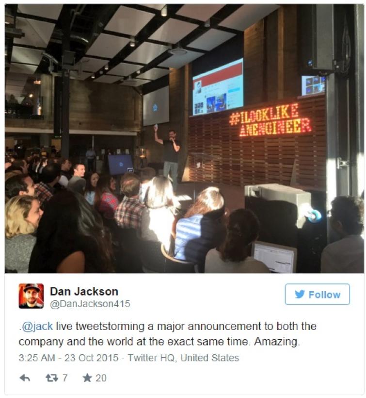 Mai mult, Dorsey a anunțat acest lucru pe Twitter în timp ce era pe o scenă mare în fața angajaților: