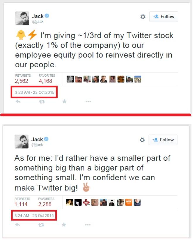 Această mișcare vine la doar o săptămână de când Dorsey a anunțat prin intermediul SEC filing că a dat 15 milioane de acțiuni înapoi companiei pentru care este și CEO și a Fundației Start Small. Și el va da înapoi 40 de milioane de acțiuni fundației, care investește în întreprinderi și persoane creative mici, cum ar fi artiști și muzicieni.