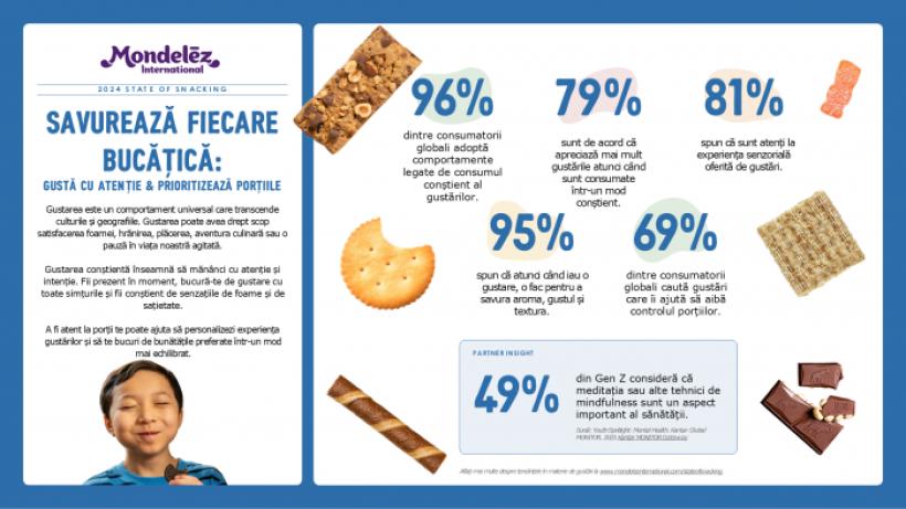 Mondelēz International a publicat recent cel de-al șaselea raport anual „State of Snacking” și a dezvăluit faptul că în rândul consumatorilor globali există o preocupare tot mai mare pentru gestionarea porțiilor și pentru o experiență conștientă în consumul gustărilor. Studiul arată că majoritatea oamenilor acordă o atenție sporită modului în care savurează gustările, concentrându-se pe aroma, textura și gustul acestora, dar și pe dimensiunea porției consumate.