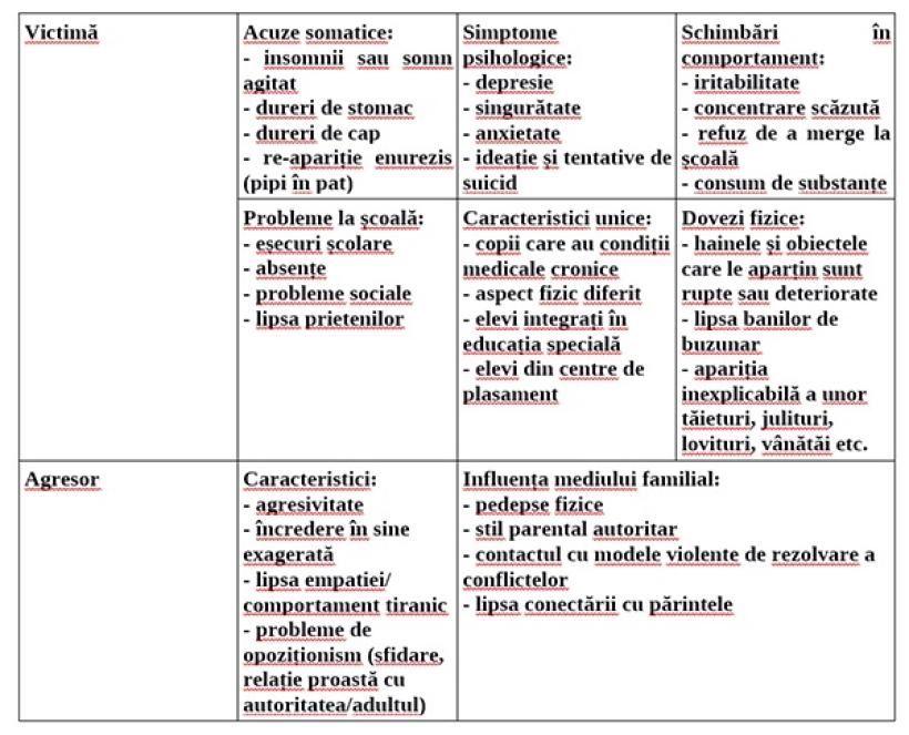 Tabelul 1. Aspecte după care se pot identifica elevii implicați în comportamente de agresivitate/intimidare[ Benga Oana, Bădan Adrian, Opre Adrian, coordonatori, „Strategii de prevenție a problemelor de comportament”, editura ASCR, 2015, Cluj Napoca