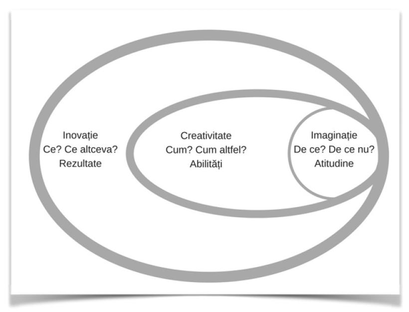 Cu imaginația ne naștem, așa cum ne naștem și cu dorința, curiozitatea esențială ("De ce?"). Imaginația reprezintă deschiderea noastră către necunoscut. Creativitatea, în schimb, reprezintă gradul în care încercăm să găsim soluții la o problemă (o "variabilă necunoscută") - pe care o dorim rezolvată. Inovația înseamnă aplicarea în realitate a celor mai bune dintre aceste idei.