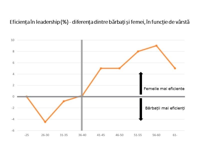 În concluzie, la prima vedere putem, într-adevăr, să spunem că femeile sunt mai bune ca lideri decât bărbații. Dar… când ne uităm mai amănunțit la rezultatele cercetării, observăm ceva interesant. Cu acest volum impresionant de date, poți face diverse interpretări relevante. Cea mai interesantă din această perspectivă este atunci când ne uităm cum sunt percepuți liderii la vârste diferite. Sub vârsta de 40 de ani, bărbații înregistrează un scor mai mare la competențele specifice leadership-ului. După 40 de ani, femeile devin mai eficiente ca lideri în comparație cu bărbații (vezi grafic 2).