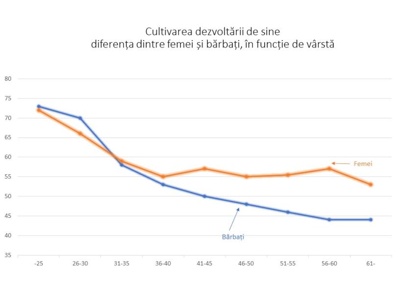Explicația pentru această stare de fapt este legată de competența ”cultivarea dezvoltării de sine”. Observăm că atunci când bărbații obțin un scor mult mai scăzut după vârsta de 40 de ani, femeile păstrează ritmul în ceea ce privește dezvoltarea de sine. Și devin lideri mai buni decât bărbații (vezi grafic 3).
