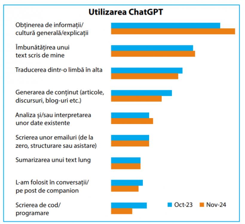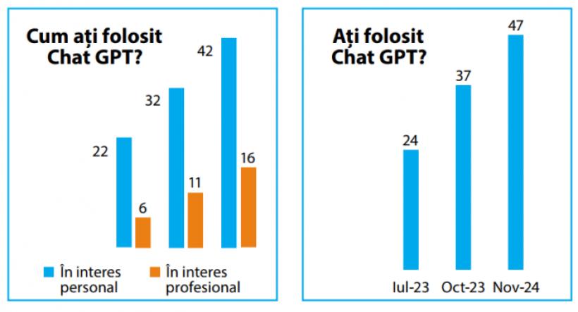 Utilizarea ChatGPT în scopuri profesionale (16%) este mai redusă decât cea în scopuri personale (42%), dar crește mai repede de la un an la altul (+170% profesional față de +91% personal între iunie 2023 și noiembrie 2024). De altfel, peste trei sferturi din români cred că "Inteligența artificială va ajuta mult la creșterea productivității".