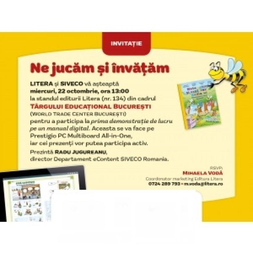 Litera și SIVECO vă invită la prima demonstrație de lucru pe o tablă interactivă a manualului digital de Matematică și explorarea mediului pentru clasa I. Profesorii, părinții, copiii și toți cei interesați vor putea asista la o prezentare interactivă unică, realizată pe un suport inovator: Prestigio PC Multiboard All-in-One și pe mai multe tablete. De asemenea, cei prezenți vor putea folosi echipamentele tehnice puse la dispoziție pentru a testa lucrul cu manualul digital.Prezentarea va fi susținută de către Radu Jugureanu, directorul departamentului eContent din cadrul companiei SIVECO Romania.