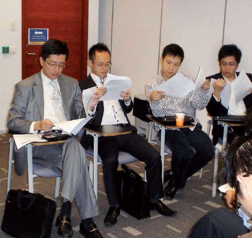 Am plecat cu lectiile facute, cunosteam clientii majori ai cursantilor, cateva dintre proiectele lor de referinta si chiar cateva lucruri personale despre cursantii mai in varsta, pentru a putea sa-i laud si sa apelez la experienta lor. Astfel instruit, n-am fost surprins de "dansul bizar" al schimbului de carti de vizita. Acestea se primesc intotdeauna cu doua miini, fiecare se uita atent la ce scrie pe cartonasul alb si scoate sunete de admiratie atunci cand desluseste functia celuilalt.