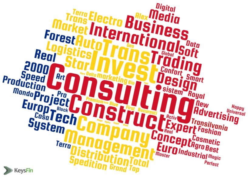 Faptul că românii umblă cu SRL-ul vopsit în culori occidentale este confirmat de statistica KeysFin care arată că cele mai multe firme active, 11.595, poartă denumirea de “Consulting”, iar alte 9700 includ numele “Invest”. Denumiri foarte populare la români sunt şi “Construct” (8856), “Trans” (8272), “Company” (6851), “Design” (6212) şi, bineînţeles, “Internaţional” (6122).