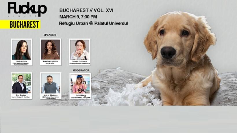 Andreea Pipernea - CEO NN Pensii, Andrei Bijutescu - CEE Regional Partner TikTok la Httpool, Sandra Ecobescu - Președinta Fundației Calea Victoriei, Dan Boabeș - Country Manager la Black Cab și Diana Mihăilă - primul Master Professional Organizer din România, ne spun poveștile lor despre eșecurile profesionale la cea de-a XVI-a ediție a Fuckup Nights Bucharest.