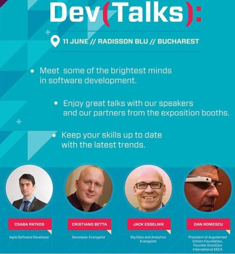Printre speakerii prezenţi ȋn cadrul Dev Talks 2014 menţionăm: Mihai Iancu - Computer Scientist Adobe, Jack Esselnik - Big Data and Analytics Evangelist IBM, Radu Popescu - Front-end developer and QA Small Footprint, Radu Iscu - Front-end developer Ness Technologies, Cristian Neicu - Application Innovation Service Mobile Practice Leader IBM, Sabin Popa - Cloud Strategy LeaderIBM, Cornel Fatulescu - Directeur Technique ISPentalog, Cristiano Betta - Developer EvangelistPayPal, Martin Peck - Senior Technology Consulting Director Oracle precum şi Dan Romescu - Founder DroidCon.