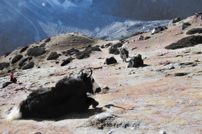 Am continuat drumul spre tabăra de bază prin Tengboche, un grup de cabane la 3.867 de metri altitudine, unde se află şi cea mai mare mănăstire budistă din regiunea Khumbu. Ghidul de trek te îndeamnă să nu urci mai mult de 600 de metri pe zi, lucru pe care îl respectam. Pentru mai multă siguranţă începusem să iau Diamox, un medicament special pentru altitudine. Din caza frigului care-mi intrase până-n oase, norma de patru litri de apă era tot mai dificil de îndeplinit. Cel mai bine se hidratau Raluca şi Cristi, care învăţaseră de la Man Bahadur să bea inclusiv apă caldă. Dimineaţă am plecat la Pangboche (3.930 m), unde am simţit pentru prima oară o amorţeală în degetele mâinilor, mai concentrată spre vârfuri. Din cauza lipsei de oxigen din atmosferă sângele nu circulă la fel de bine prin extremităţi, dar efectul este relativ neglijabil. Important este să nu te doară capul şi să nu-ţi fie greaţă. Problemele în grup au apărut în noaptea pe care am petrecut-o la Dingboche, o localitate micuţă, situată într-o depresiune la 4.410 de metri altitudine, unde vârfurile Ama Dablam şi Nupse (7.864 m) se arată în toată splendoarea. Dingboche se află într-o zonă mai plată, asta înseamnă că principalele rute mai abrupte fuseseră deja urcate.