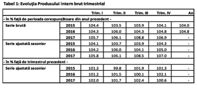 Ca urmare a revizuirii seriei brute a PIB trimestrial în vederea reconcilierii cu datele anuale şi a includerii estimării Produsului intern brut pentru trimestrul IV 2017 în seria trimestrială, seria ajustată sezonier a fost recalculată, indicii de volum fiind revizuiţi faţă de a doua variantă provizorie a Produsului intern brut pentru trimestrul III 2017, publicată în comunicatul de presă nr. 16 din 12 ianuarie 2018. Astfel :