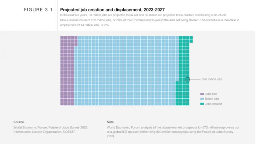 As stated in a Goldman Sachs’ report launched earlier this year, up to 300 million jobs could be disrupted by AI-powered chatbots such as ChatGPT. According to the World Economic Forum’s Future of Jobs report, over the next 5 years “69 million new jobs are expected to be created and 83 million to be eliminated, a net decrease of 14 million jobs around the world.”