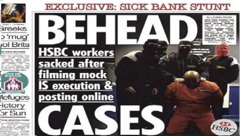 Cum s-au distrat angajaţii HSBC la un seminar de motivare? Au făcut un joc de roluri. Un bărbat, îmbrăcat în salopetă portocalie a stat în genunchi în timp ce colegii lui, îmbrăcaţi în salopete negre, l-au decapitat cu o curea. Totul a fost filmat şi postat pe o reţea de socializare de către cei care au partcipat la acţiune, foarte mândri de isprava lor.