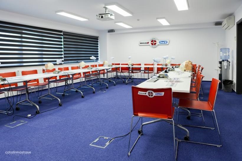La etajul al doilea, forFITOUT a amenajat o sală de training, cu o capacitate de 25 de locuri, dotată cu aparatură de ultimă generație pentru cursanți. S-au folosit peste 140 mp de mochetă Modulyss iar contrastul s-a creat cu poziționarea a peste 25 de scaune în nuanțe de roșu aprins, marca Italian Sedioliti ce aduc eleganța și ergonomia stilului italian pe strada Bucureștiului. Cele 10 mese de lucru albe dispun de prize Bachman incorporate pe fiecare desk de lucru și reușește să păstreze acuratețea întregului design.