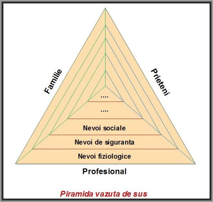 Dacă în “Triunghi” trecerea la un nivel superior este condiționată de satisfacerea nivelului inferior, în realitate, influența a cel puțin trei medii, dependente între ele – serviciu, familie și prieteni – generează modificări de stări, dar și coexistența mai multor nivele pe piramida lui Maslow.