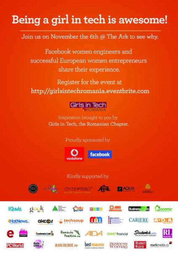Evenimentul de lansare al Girls in Tech România va avea loc marţi, 6 noiembrie, la The Ark. Participarea la eveniment este gratuită şi se realizează prin completarea formularului de înscriere disponibil online la http://girlsintechromania.eventbrite.com/. Organizatorii îşi rezervă dreptul de a refuza participarea unora dintre persoanele înscrise la eveniment pentru a păstra audienţa relevantă.