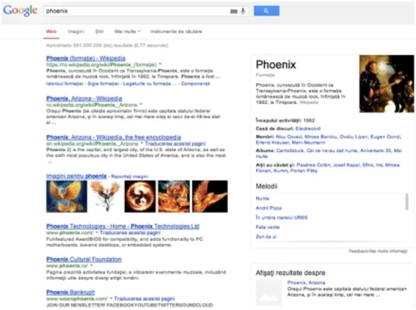 Cuvintele pot fi ambigue – interogarea se referă la formația Phoenix sau la localitatea cu același nume? Google poate înţelege diferenţa şi restrânge rezultatele căutării doar la ceea ce îl interesează pe utilizator – un singur click pe unul din link-uri oferă rezultatul care era de interes: