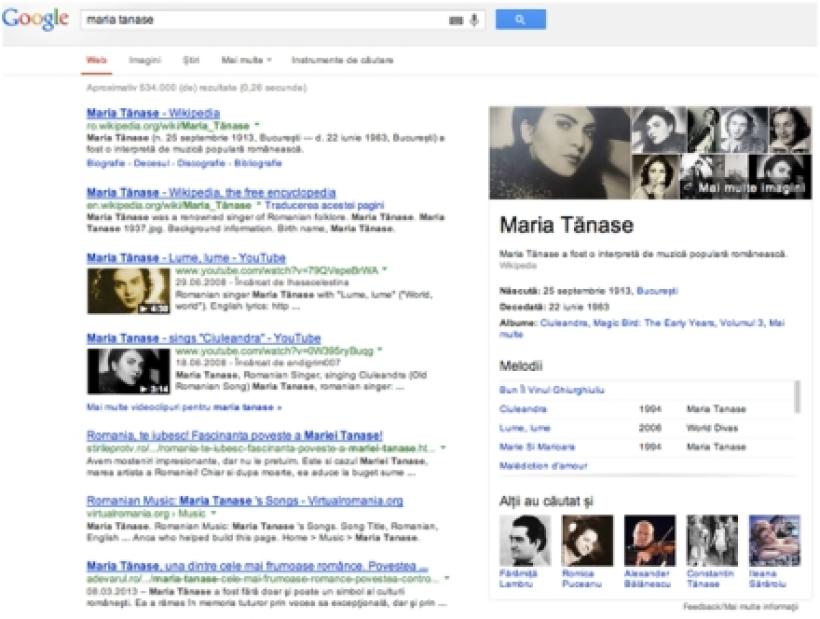 Cu ajutorul Knowledge Graph, Google înţelege mai bine interogarea, aşa că poate sintetiza informații despre acel subiect. De exemplu, pentru căutarea Maria Tănase, apar informații despre perioada de viață, dar și detalii despre cele mai cunoscute melodii interpretate de cântăreață.