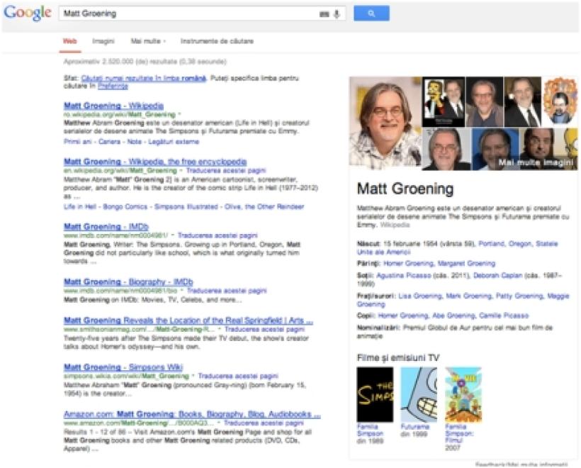 Nu în ultimul rând, partea cea mai distractivă este că utilizatorii pot face descoperiri neașteptate cu ajutorul Knowledge Graph. O nouă căutare sau conexiune duce utilizatorul la o nouă informație. De exemplu: de unde a luat Matt Groening, creatorul familiei Simpson, ideea pentru numele lui Homer, Marge şi Lisa, personajele serialului? Răspunsul îl oferă informațiile despre familia lui.