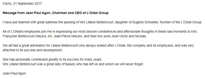 „Tocmai am aflat cu mare tristețe trecerea în neființă a doamnei Liliane Bettencourt, fiica lui Eugène Schueller, fondatorul grupului L'Oréal. Toți angajații companiei mi se alătură în exprimarea celor mai sincere condoleanțe și gânduri de compasiune în aceste momente triste către doamna Françoise Bettencourt Meyers, dl Jean-Pierre Meyers și cei doi fii ai lor, Jean-Victor și Nicolas. Cu toții am avut o mare admirație pentru Liliane Bettencourt, care a avut întotdeauna grijă de angajații săi și a fost foarte atașată de dezvoltarea companiei. Ea a contribuit personal la succesul companiei mulți ani la rând. D-na Liliane Bettencourt a fost o doamnă de o frumusețe desăvârșită care ne-a părăsit și pe care nu o vom uita niciodată”, își încheie managerul mesajul.