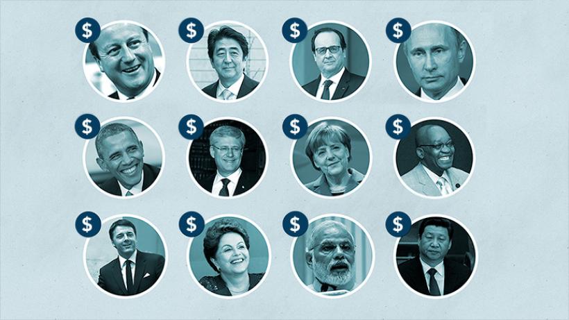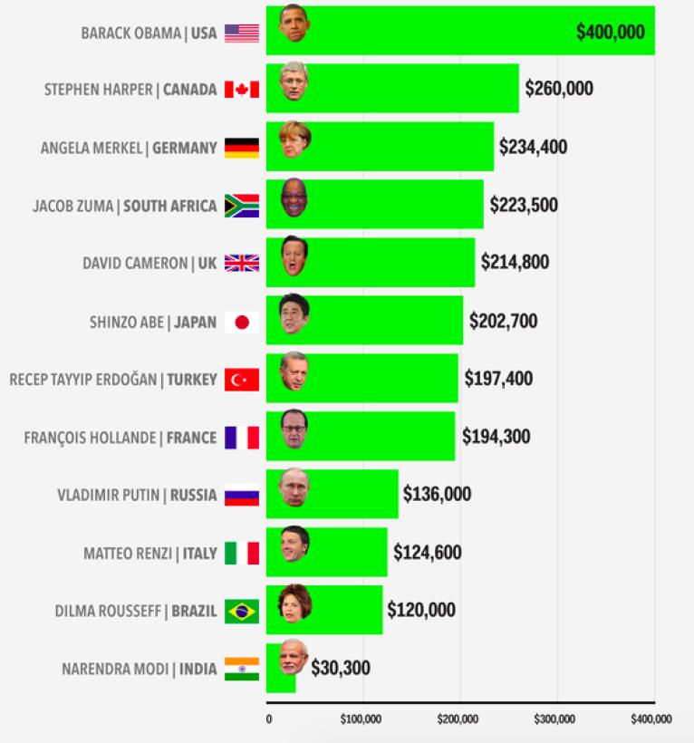 Barack Obama, președintele Statelor Unite, ocupă prima poziție a topului, cu un salariu de 400.000 de dolari. Acesta este urmat de Stephen Harper, președintele Canadei, care câștigă 260.000 de dolari.