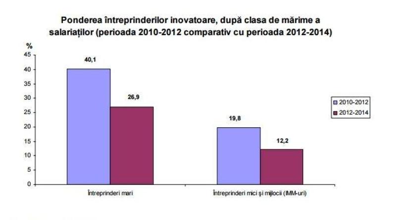 În perioada analizata de INS întreprinderile mari cu 250 salariați și peste,au fost mai inovatoare decât întreprinderile mici și mijlocii (IMM-uri), respectiv cu 10-249 salariați. Rezultatele provizorii ale cercetării statistice privind inovația arată că, în perioada 2012-2014, în rândul întreprinderilor din mediul de afaceri, ponderea întreprinderilor care au introdus sau au implementat produse, procese, metode de organizare sau metode de marketing, noi sau îmbunătățite semnificativ a fost de 12,8%, în scădere cu 7,9 puncte procentuale față de perioada 2010-2012.