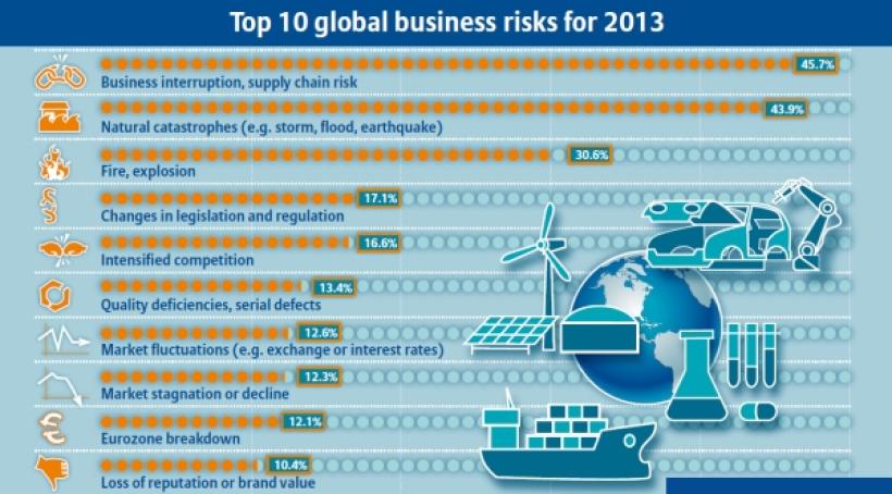Experţii Allianz consideră riscul de întrerupere a afacerilor şi a lanţului de aprovizionare drept cel mai mare risc pentru companii (46% dintre răspunsuri). Multora dintre companiile care au optat pentru lanţuri de aprovizionare globale pentru a reduce costurile le lipseşte o variantă alternativă de aprovizionare. “Dezastrul inundaţiilor din Thailanda ne-a arătat că întreruperea afacerilor unui furnizor cheie a creat efecte resimţite la nivelul unei întregii industrii”, explică specialistul în asigurări de bunuri din cadrul AGCS, Volker Münch.
