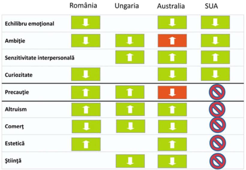Desi in Romania nu exista nicio diferenta statistica intre barbati si femei in ceea ce priveste diplomatia, sociabilitatea, tactul si receptivitatea, in Ungaria, SUA si Australia femeile tind sa obtina scoruri mai ridicate decat barbatii la scala senzitivitate interpersonala (sunt mai atente la nevoile celor din jur, la mesajul transmis, mai diplomate).Desi in Romania nu exista nicio diferenta statistica cu privire la valorizarea unei abordari analitice fata de rezolvarea problemelor, femeile din Ungaria, Australia tind sa inscrie scoruri mai mici la aceasta dimensiune (stiinta).