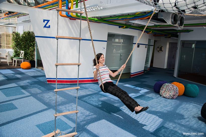 În sediul pe care Zitec îl ocupă, în zona Pieței Vitan, într-o clădire de birouri nouă, unde a închiriat două etaje, nu simți stresul cu care ne-au obișnuit afacerile competitive. Cel puțin ca vizitator. Pe holuri muzica se aude în surdină, aproape ca într-un spa, spațiile sunt largi, dar de dimensiuni diferite și decorate astfel încât să-ți amintească de un interior de submarin, de o tavernă grecească, de un loc de joacă sau de o grădină urbană. Interviul pe care Alex Lăpșan mi l-a acordat s-a petrecut în umbra unei hărți verzui, cât un perete, reprezentând un ținut imaginar, marcată într-un colț de o siglă construită după modelul unui simbol heraldic. Sunt acolo elefanții de la PHP, mâna cu care dăm like pe Facebook, pătrățelele companiei Microsoft, Z-ul Zitecului și câteva cuvinte, în engleză, care pot fi citite diferit. Eu identific: Make soft ware.