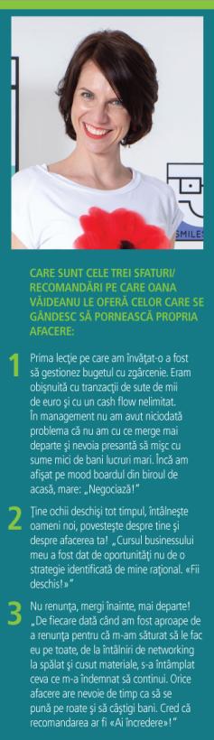 Oana Văideanu a decis să renunțe la poziția de Manager General al companiei Hamm Reno SRL în vara lui 2015, când împlinea zece ani în companie. Lucrase pe post de top-manager timp de cinci ani, din 2010. E greu de spus dacă a fost o alegere lucidă sau emoțională, poate să fi fost un pic din ambele. „Mi-aduc aminte că am fost foarte supărată că, datorită schimbării de management în Germania, mi s-a propus să mă întorc la funcția de director de vânzări. Probabil că decizia rațională ar fi fost să accept și să continui să muncesc pe salariul de manager general și funcția de director de vânzări, urmărind siguranța financiară până la găsirea unui nou post. Eu am hotărât să negociez un pachet de ieșire din contract ca să pot să încep alături de soțul meu o afacere. Am riscat. Însă eu cred în mitul creației. Nimic nu poate exista fără sacrificiu.” Se mai gândea atunci că, dacă nu face pasul spre antreprenoriat, mai târziu îi va fi și mai greu. Are convingerea că șansele în management scad pe măsură ce înaintezi în vârstă, în special pentru femei. „E o realitate tristă, și nu doar în România.”, comentează ea.