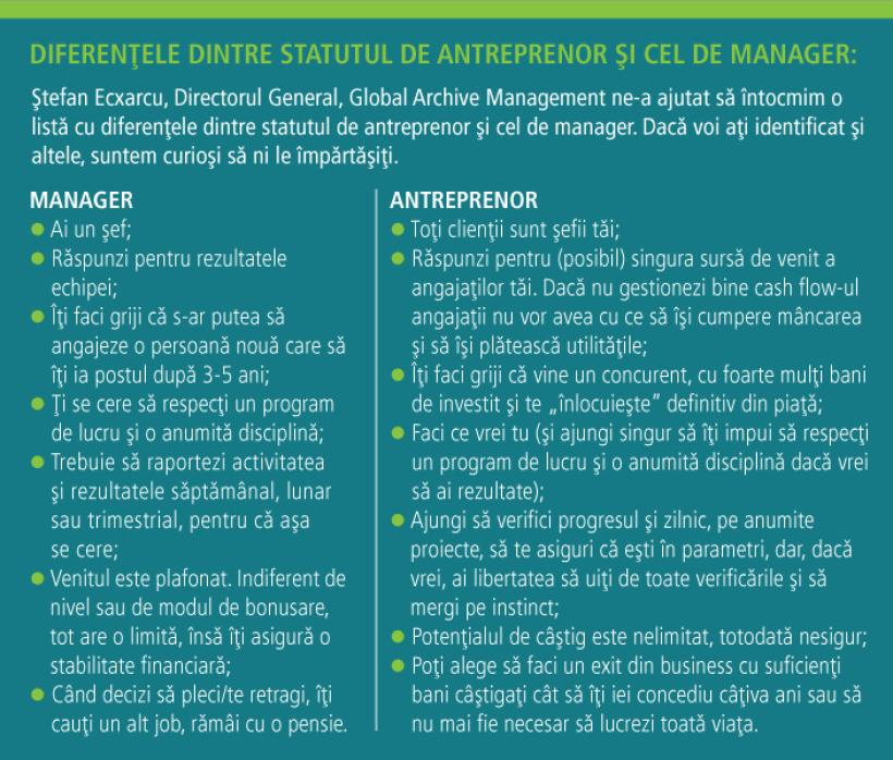 Ştefan Ecxarcu, Directorul General, Global Archive Management ne-a ajutat să întocmim o listă cu diferențele dintre statutul de antreprenor și cel de manager. Dacă voi ați identificat și altele, suntem curioși să ni le împărtășiți. Diferențele dintre statutul de antreprenor și cel de manager: (vezi tabelul)