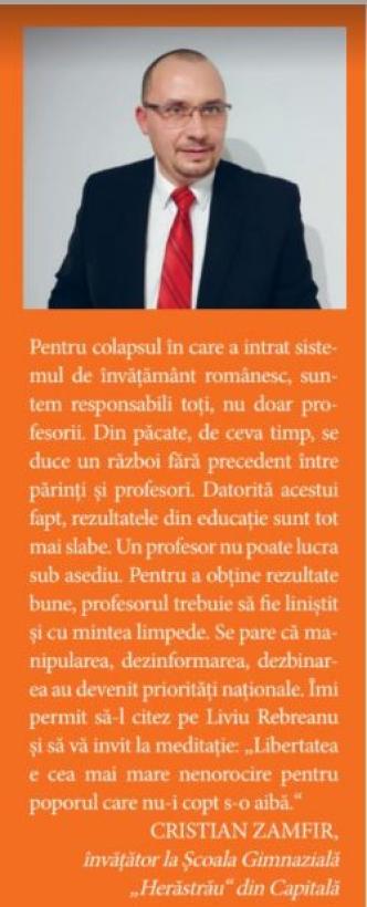 Mulți încearcă această profesie, puțini sunt cei care rezistă și reușesc. Dacă ți-ai ales această meserie, este esențial să ai o relație specială cu elevii tăi, susține cu ardoare Cristian Zamfir. Asta presupune să fii apropiat de ei, să-i asculți, să-i înțelegi, să-i ajuți, să-i corectezi și să-i îndrumi. „Dacă nu poți face asta, clar trebuie să pleci într-un alt domeniu de activitate. A fi profesor înseamnă dragoste, respect, energie, răbdare, bună comunicare, lumină, schimbare... cu alte cuvinte, virtuți alese. Cred c-ar trebui să înțelegem că educația o facem toți, nu doar profesorii.
