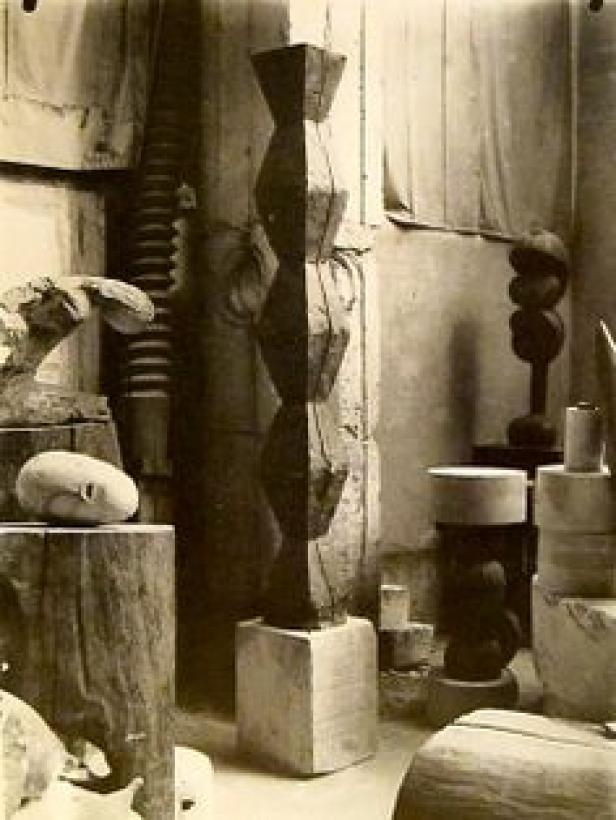Anul 1915 a marcat o premieră în cariera lui Brâncuşi - primele lucrări în lemn: "Cariatide", "Fiul risipitor". În 1916, a realizat prima "Coloană a Sărutului", folosită apoi ca motiv sculptural pe stâlpii "Porţii Sărutului". Aceasta din urmă a fost definitivată în 1940 şi amplasată în parcul central din Târgu Jiu. În 1919 a apărut, la Paris, volumul "La Roumanie en Images", cuprinzând cinci reproduceri după lucrările sale. Brâncuşi începe să-şi expună lucrările în cele mai celebre galerii de artă din Franţa, Anglia, Elveţia, Olanda şi America, fiind elogiat în numeroase publicaţii din întreaga lume. În 1931 a fost decorat, la propunerea lui Nicolae Iorga, cu Ordinul "Meritul cultural pentru artă plastică". Până în 1940 activitatea creatoare a lui Brâncuşi s-a desfăşurat în toată măreţia ei, din această perioadă datând operele din ciclul ''Pasărea în văzduh'', ciclul ''Ovoidului'' precum şi sculpturile în lemn. La 11 februarie 1935 Constantin Brâncuşi a acceptat propunerea Ligii Naţionale a Femeilor din judeţul Gorj, prezidată de Areţia G. Tătărăscu, de a înălţa, la Târgu Jiu, o "Coloană" în cinstea eroilor căzuţi în războiul mondial. Astfel, în 1938, finalizează ansamblul artistic din Târgu Jiu alcătuit din "Masa Tăcerii", "Scaunele", "Poarta Sărutului" şi "Coloana Infinitului", închinat eroilor români care, la 14 octombrie 1916, au căzut în bătălia de la Jiu împotriva nemţilor.
