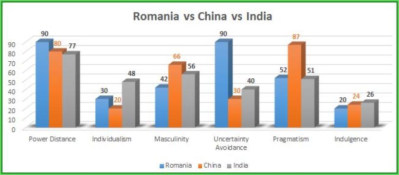 Din punctul de vedere al dimensiunilor Power Distance și Individualism nu există diferențe majore între cele trei. Prima dimensiune care pare că lucrează în defavoarea României este Masculinity, competitivitatea societăților chineze și indiene fiind puțin mai ridicată decât a societății românești. România recuperează însă la Uncertainty Avoidance, pentru că scorul mult ridicat obținut de România îi poate determina pe eventualii investitori să gândească că teama de incertitudini îi face pe români să fie mult mai stabili din punctul de vedere al locului de muncă decât indienii și chinezii. Mai iese în evidență scorul mare obținut de China la Pragmatism, un scor care se înscrie în tendința culturilor asiatice (vezi și Japonia mai jos) și care caracterizează o perseverență în atingerea rezultatelor și o gândire pe termen lung.