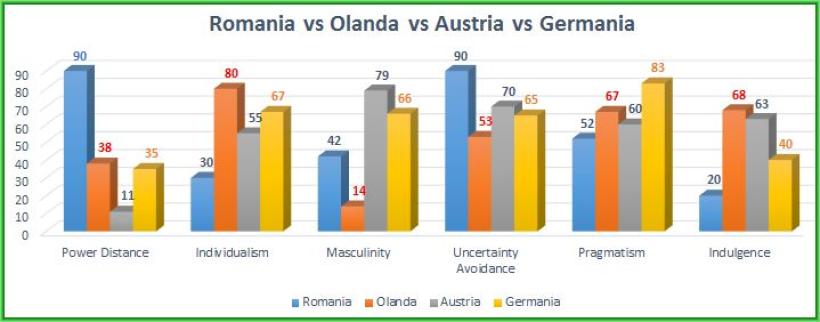 Cel puțin pe trei dimensiuni pare că România face parte dintr-o lume total diferită: Power Distance, Individualism si Indulgence. Dacă un scor mare la Power Distance poate fi văzut că un avantaj de către investitori, atitudinea de „așteptare” și de pesimism care rezultă din scorurile mici de la Individualism și Indulgence pot fi niște dezavantaje costisitoare (nu numai pentru investitori). Scorul la Uncertainty Avoidance echilibrează însă lucrurile, pentru că teama de incertitudine face ca majoritatea membrilor societății românesti să pună preț pe stabilitatea locului de muncă și să fie capabili să muncească din greu pentru a-l păstra.