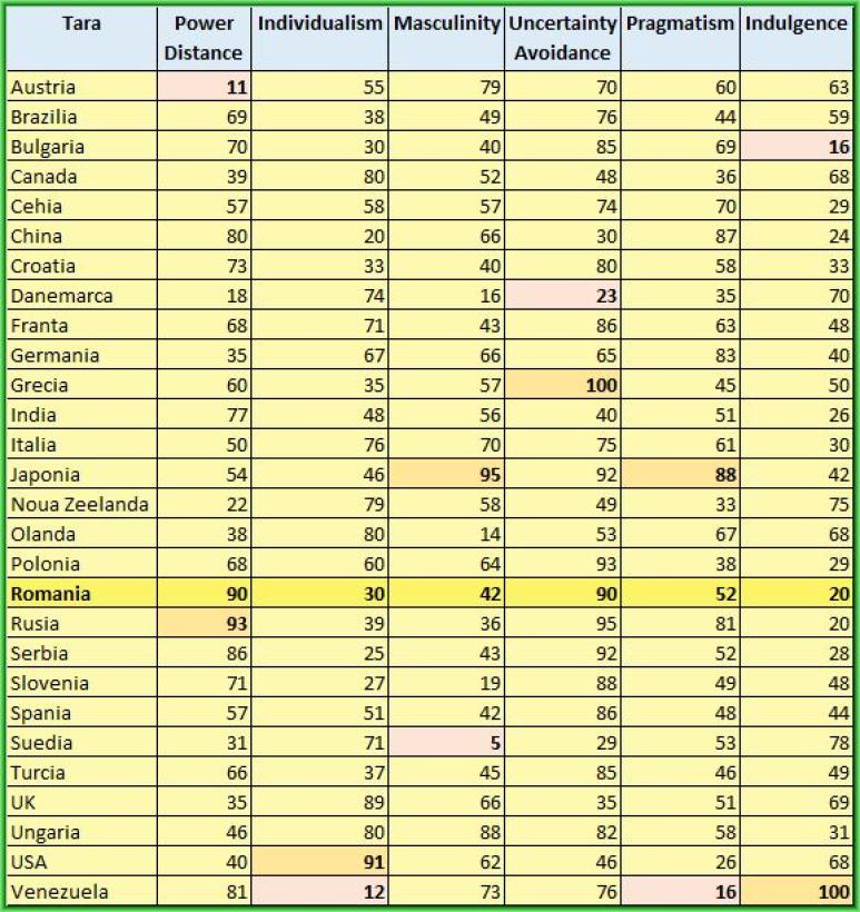 Iată și o listă comparativă a 28 de țări pe cele 6 dimensiuni culturale ale modelului, lista care poate sta la baza multor analize care să reliefeze mai mult decât competitivitatea japoneză și cinismul românesc: