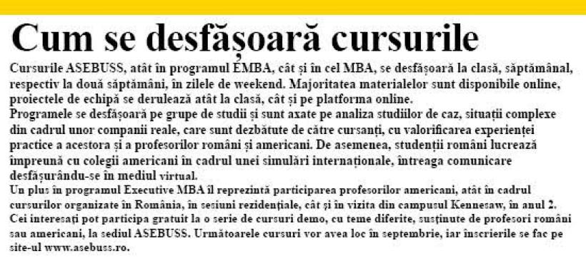 În ultimii 15 ani, Executive MBA ASEBUSS este oferit în parteneriat cu Kennesaw State University, Atlanta, SUA, o universitate aflată în top 25 în America de Nord și cea mai puternică școală de afaceri reprezentată în România.