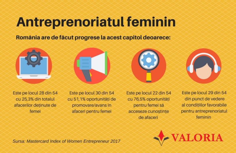 În Romănia, femeile reprezintă o minoritate în cadrul comunității de afaceri, deoarece, chiar dacă ele constituie 51% din totalul populației. Conform studiului Mastercard din 2017 asupra antreprenoriatului feminin în 54 de țări din lume, România este pe locul 28, cu doar 25,3% din totalul numărului de afaceri deținute de femei, comparativ cu 30,8% în Spania, 29,6% în Polonia și 27,8% în Ungaria.