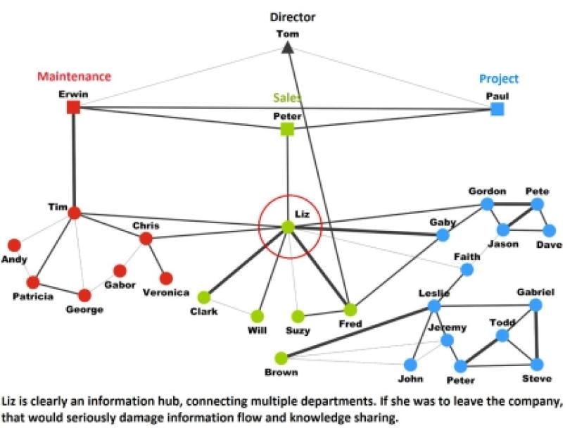 (Foto caption: Liz este, în mod clar, un „punct central informaţional”, conectând mai multe departamente. Dacă ar fi să plece din companie, plecarea ei ar afecta în mod grav fluxul de informaţii şi procesul de distribuire a cunoştinţelor).