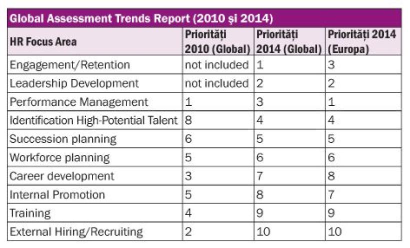 Schimbarea focusului şi investiţiilor dinspre atragerea şi pregătirea candidaţilor din extern către managementul forţei de muncă existente. Cele mai importante modificări înregistrate în intervalul de patru ani dintre cele două studii vizează activităţile de dezvoltare şi mobilizare a forţei de muncă existente. Engagement-ul şi dezvoltarea leadership-ului sunt teme care nu existau în topul priorităţilor în anul 2010. Patru ani mai târziu, nu numai că aceste teme sunt raportate în topul priorităţilor, ci ocupă primele locuri în clasamentul indicat de participanţi iar prioritatea #4 constă în identificarea eficientă a potenţialelor talente. Toate aceste schimbări atrag o serie de implicaţii şi provocări.