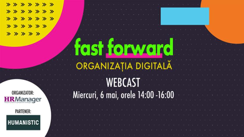 Revista HR Manager organizează miercuri 6 mai, între orele 14.00 – 16.00, evenimentul online „FAST FORWARD. ORGANIZAȚIA DIGITALĂ”, în cadrul căruia se va discuta despre cum ne adaptăm la dinamica schimbării digitale și cât de profundă este această schimbare în mentalitatea oamenilor și în structura proceselor.
