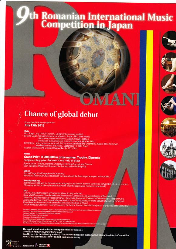 Pentru cei 116 înscrişi de anul acesta se vor acorda premii în valoare de 500.000 de yeni (cca 5.000 euro), printre recompense aflându-se şi invitaţia de a susţine recitaluri în România în toamna anului viitor, premii din partea ambasadei României şi Radio România Cultural ş.a. .